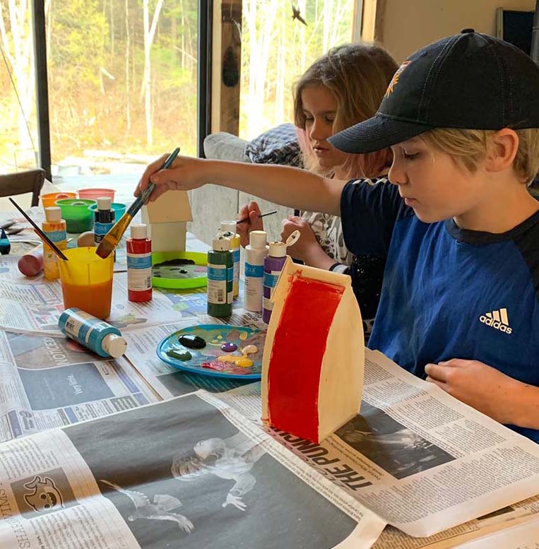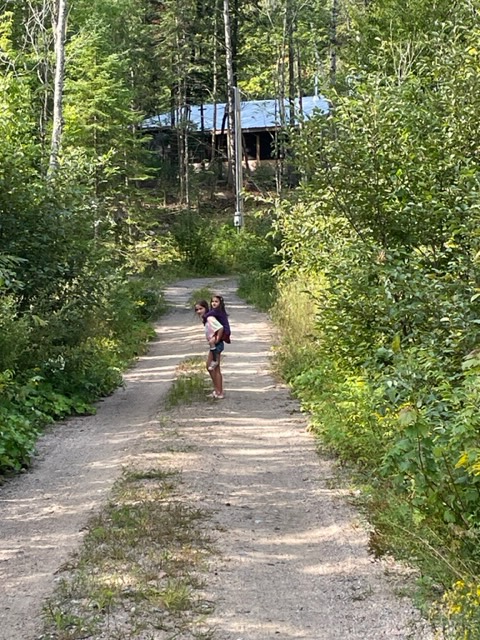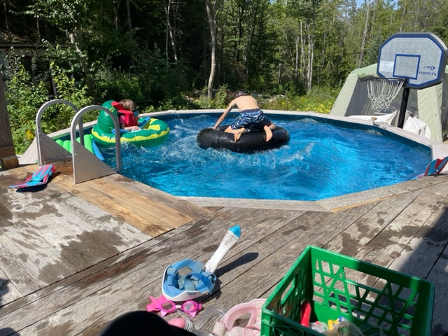We live in Duclos on ten acres of forest with trails throughout and, bugs permitting, we can get some inspiration by collecting leaves and sticks. We break up the day with a dip in the pool and a good jump on the trampoline or chilling out in the screen tent.